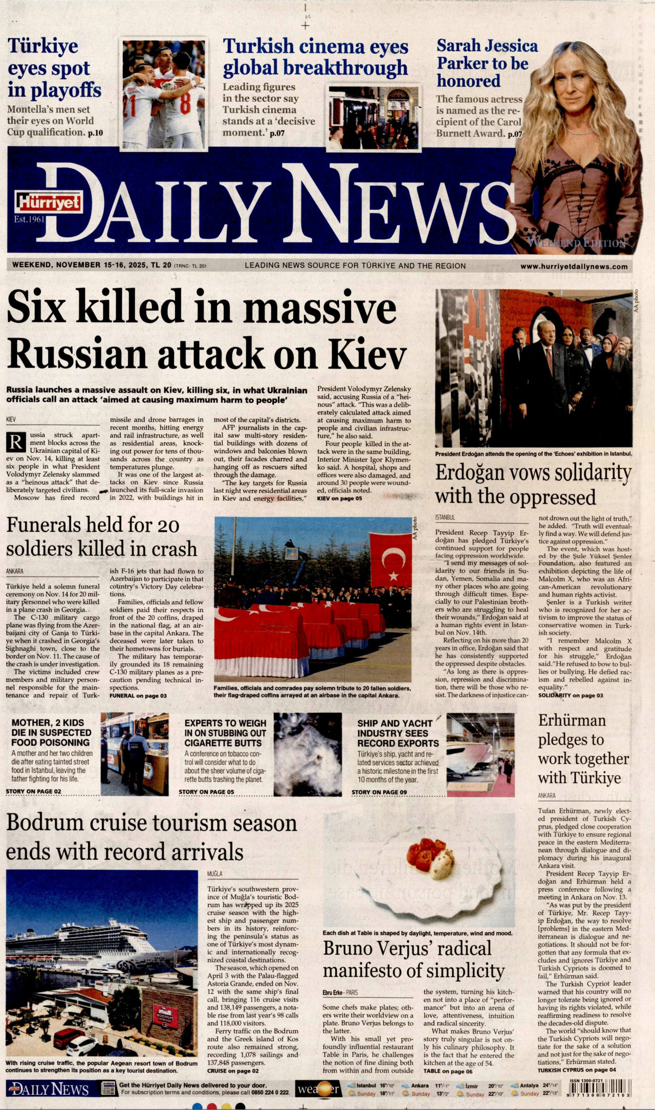 HÜRRİYET DAİLY NEWS Gazetesi 15 Kasım 2025, Cumartesi Günü Manşeti