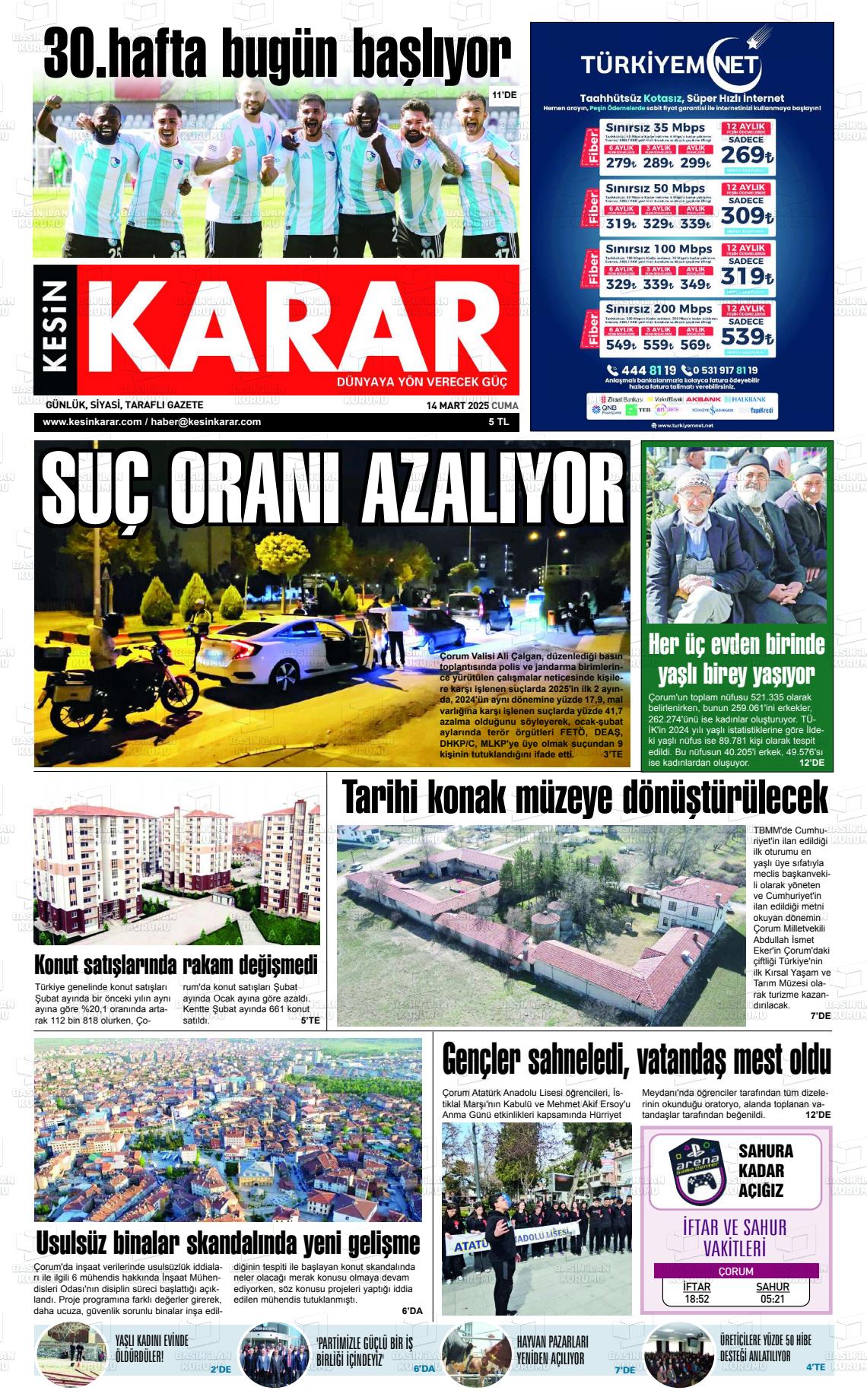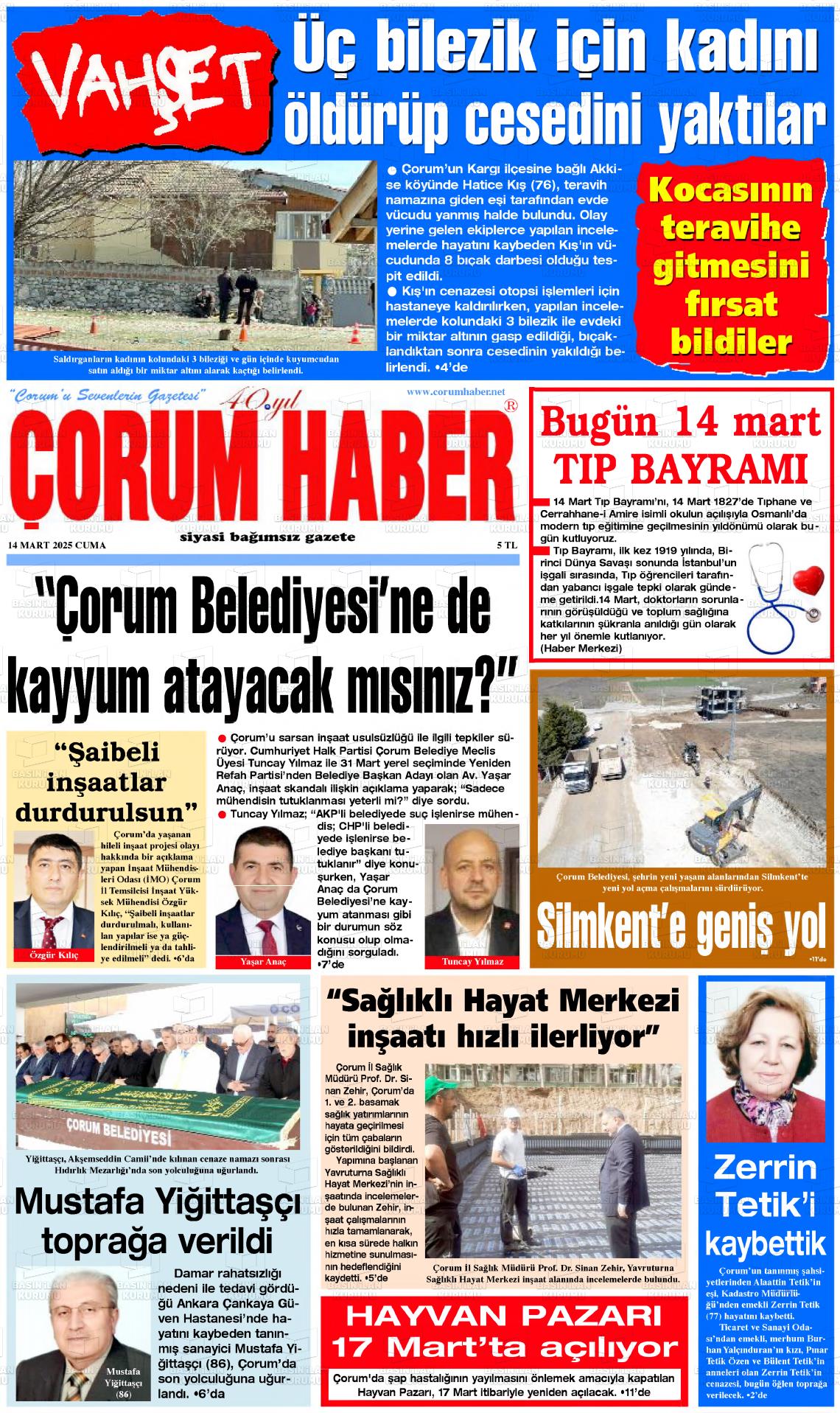 Çorum Yerel Gazeteleri 29 Kasım 2025, Cumartesi Günü Manşeti