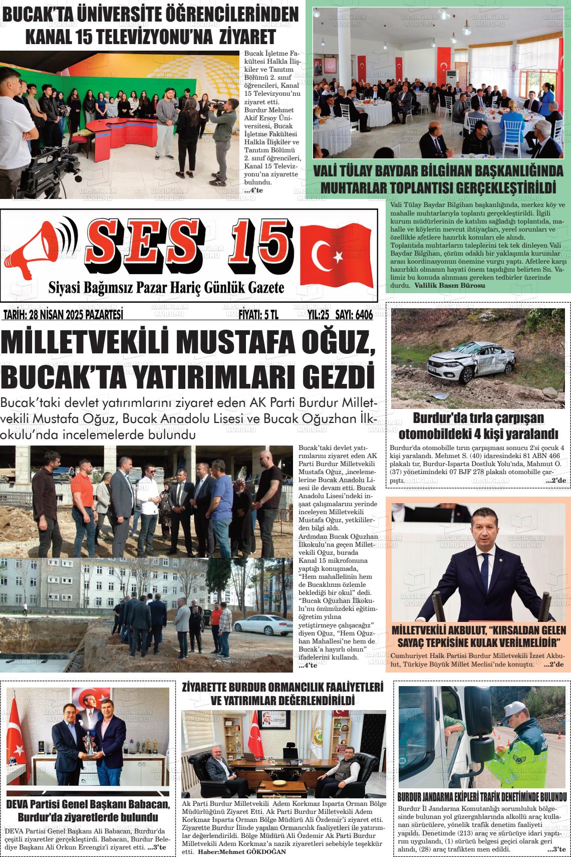 Burdur Yerel Gazeteleri 15 Kasım 2025, Cumartesi Günü Manşeti