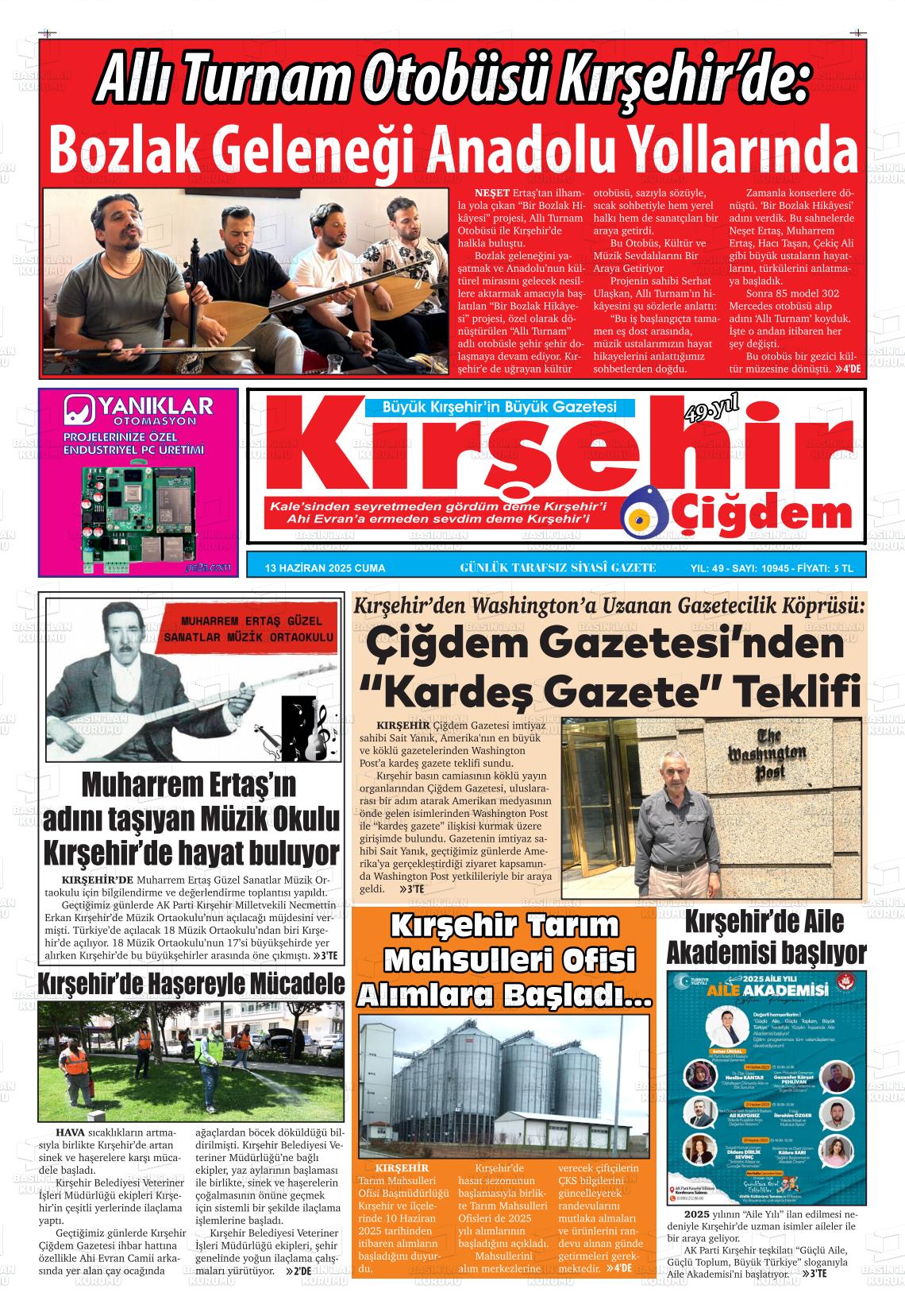 Kırşehİr Yerel Gazeteleri 15 Kasım 2025, Cumartesi Günü Manşeti